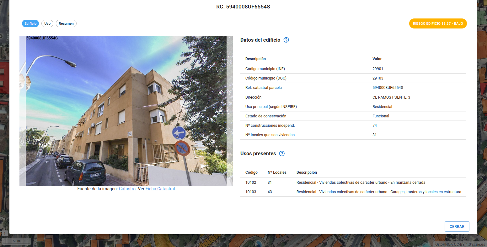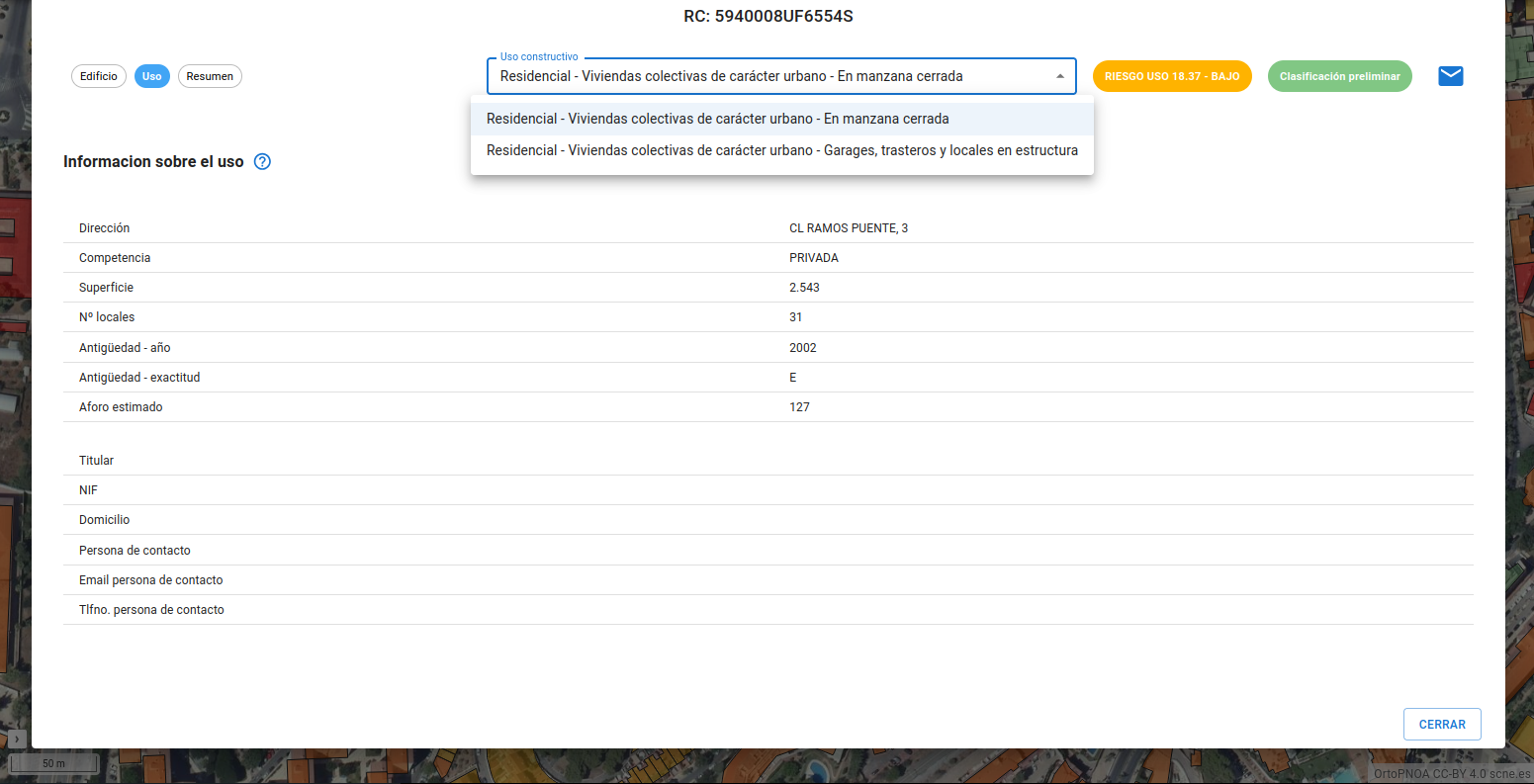 La opción “Edificio” muestra información general del mismo, el listado de los distintos usos presentes en el inmueble, y el valor de la clasificación preliminar de riesgo asignada al edificio, que será la más desfavorable de entre las clasificaciones de todos los usos presentes.